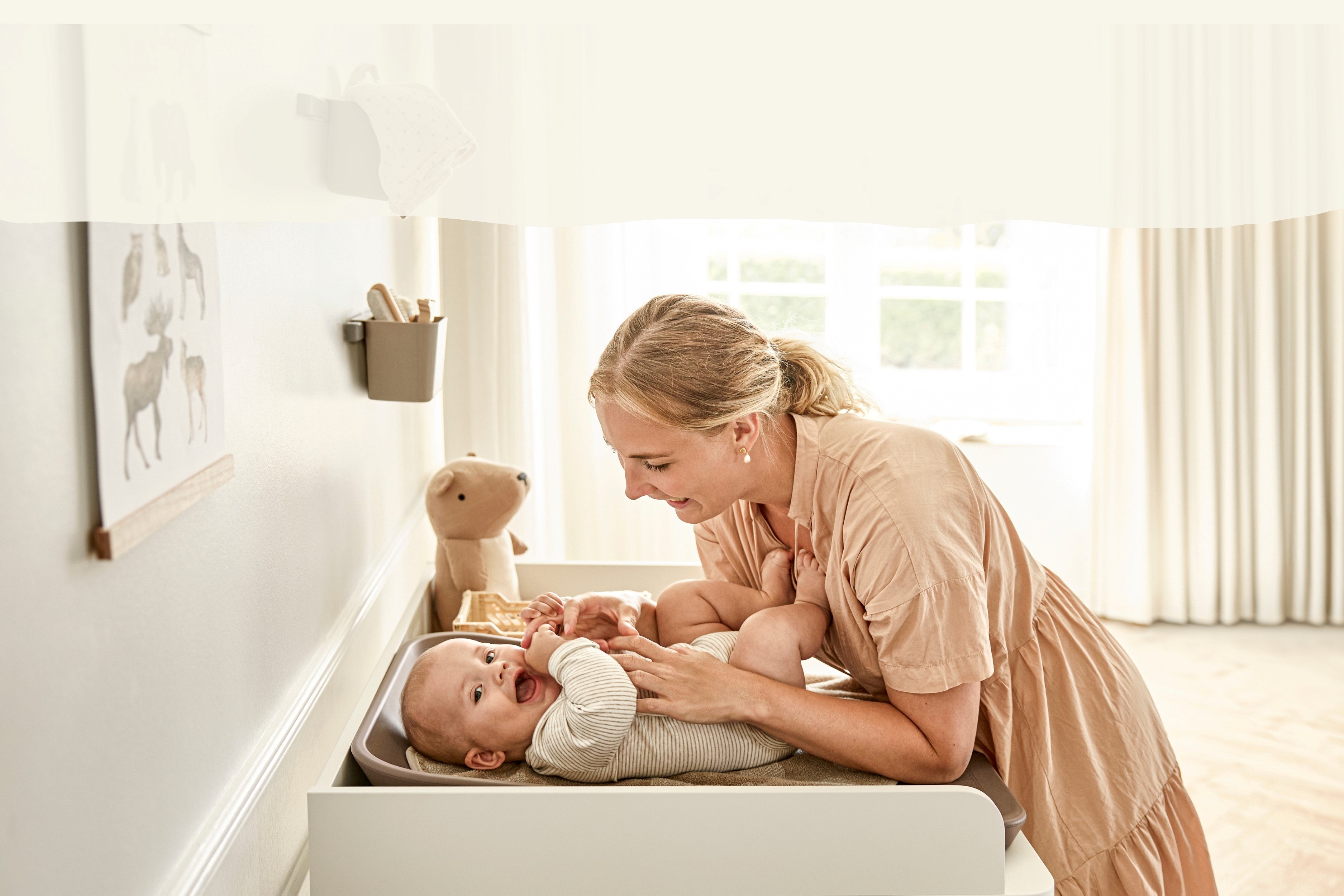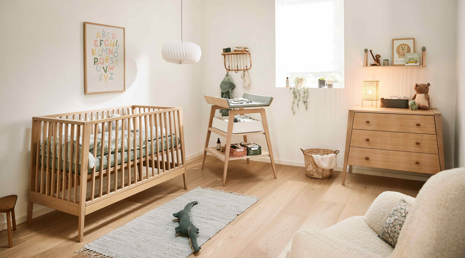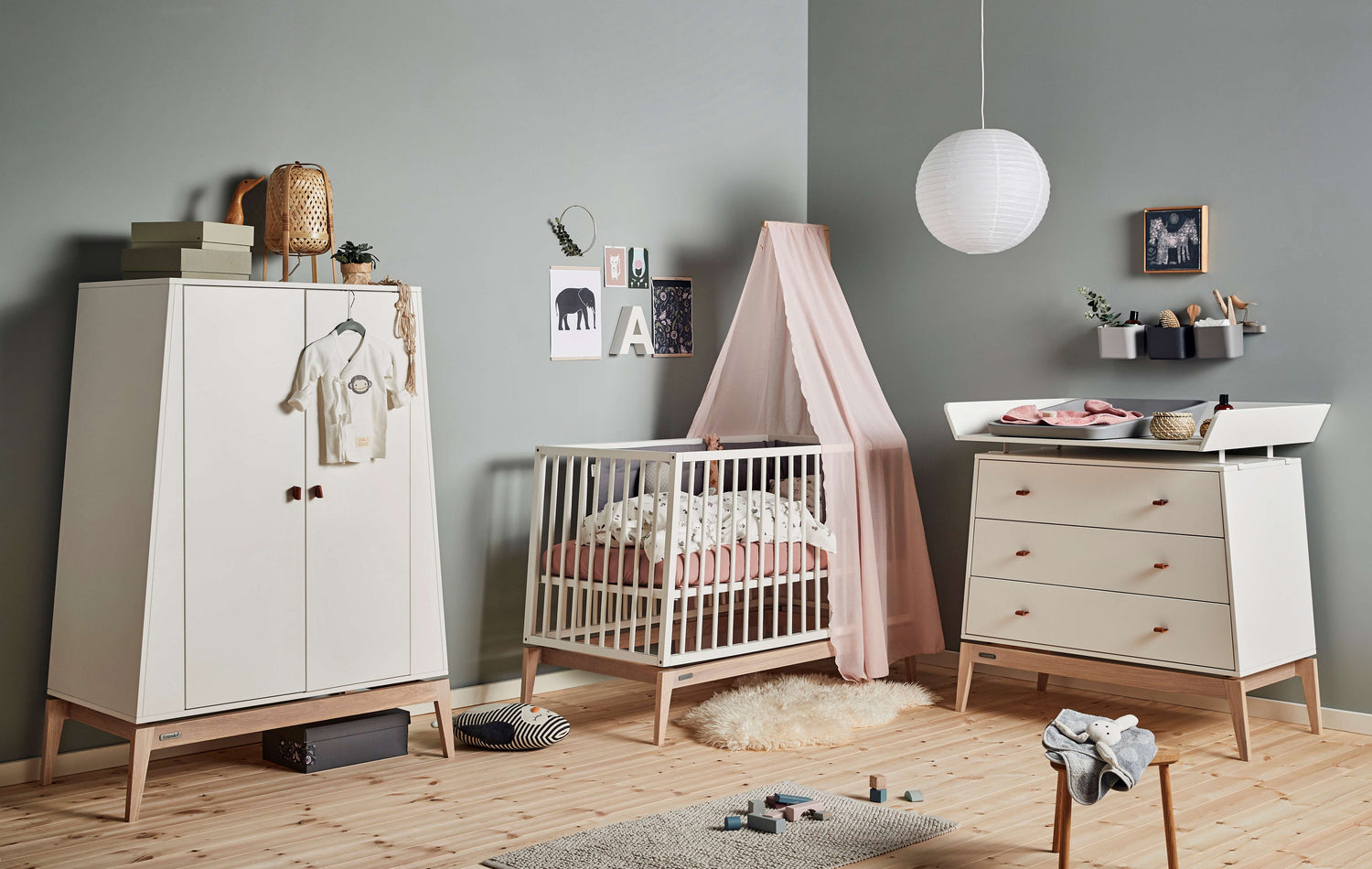 Entdecke alle Produkte der Linea™ Serie: Babybett (lässt sich mit dem Sofa Set später umbauen), Kommode (Wickelaufsatz verfügbar), Wickeltisch.