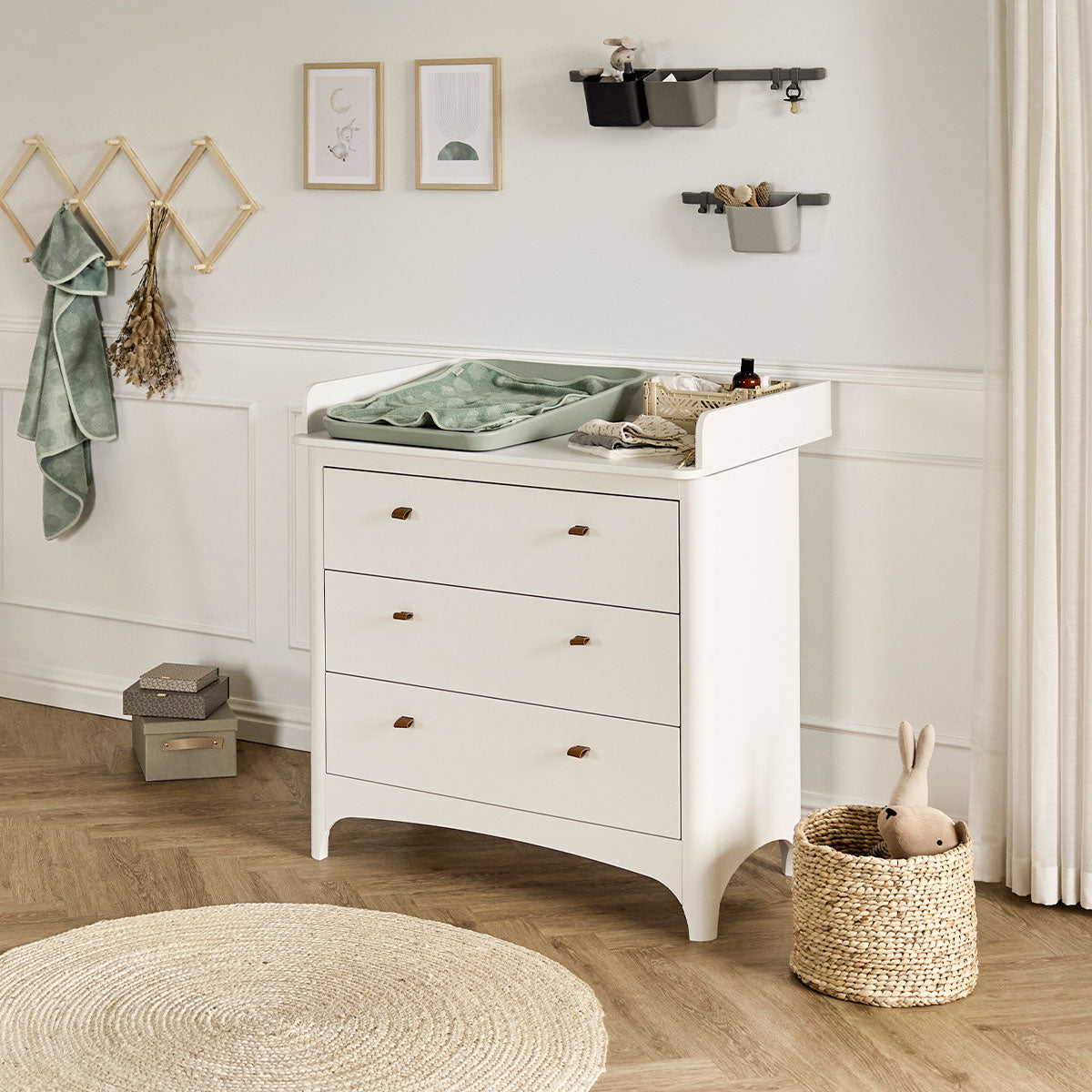 Die Leander Classic™ Wickelkommode bietet genug Platz zum Wickeln mit allem Zubehör. Darüber hinaus hilft sie, das Kinderzimmer ordentlich zu halten. Mit drei großen Schubladen bietet sie viel Platz für Kleidung und Spielzeuge. Ihr Design mit den charakteristischen Bögen und abgerundeten Ecken spiegelt die Formsprache des Leander Classic™ Babybettes wider, und durch ihre zeitlose Funktionalität passt sie auch hervorragend in andere Wohnbereiche. Ausgestattet ist die Wickelkommode mit weichen Ledergriffen, die sich leicht durch andere Farben oder Materialien wie Filz personalisieren lassen.